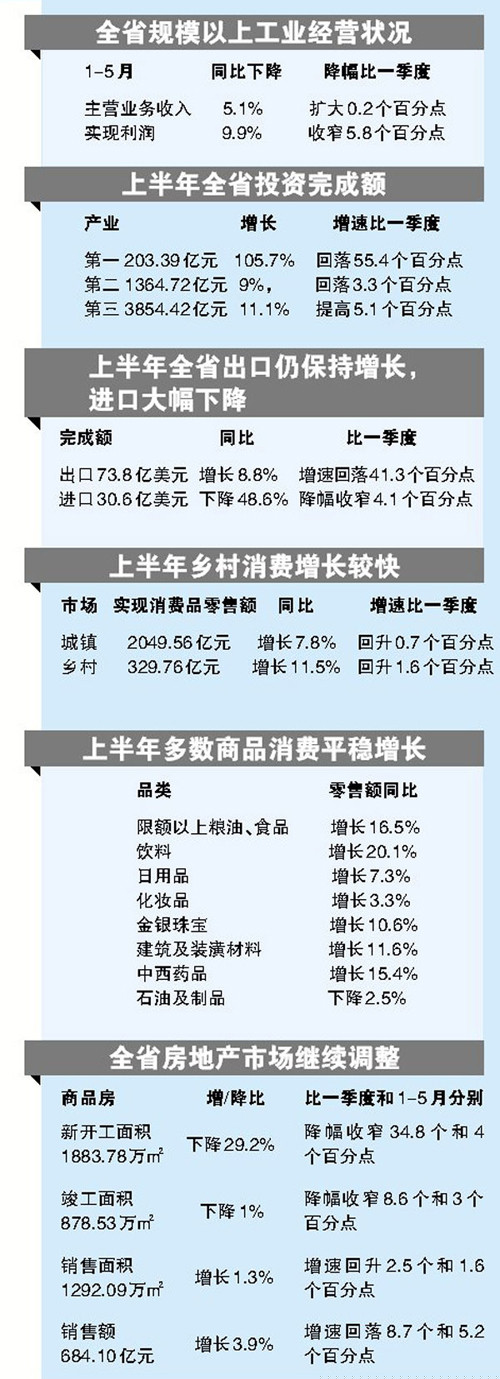 發(fā)布會上,統(tǒng)計局相關(guān)負(fù)責(zé)人表示,今年上半年,全省經(jīng)濟(jì)運行經(jīng)歷了一季度的低迷后,在各項穩(wěn)增長政策的有力作用下,各項經(jīng)濟(jì)指標(biāo)從二季度開始回歸到平穩(wěn)增長的軌道,并呈現(xiàn)企穩(wěn)回升向好的積極態(tài)勢。但穩(wěn)增長壓力依然較大,經(jīng)濟(jì)回升的基礎(chǔ)仍有待夯實。隨著狠抓穩(wěn)增長、促改革、調(diào)結(jié)構(gòu)、惠民生、防風(fēng)險政策措施的落實到位,第三季度將進(jìn)一步鞏固經(jīng)濟(jì)運行回升向好的勢頭,第四季度向著全年預(yù)期發(fā)展目標(biāo)攻堅沖刺,努力實現(xiàn)各項目標(biāo)任務(wù)。